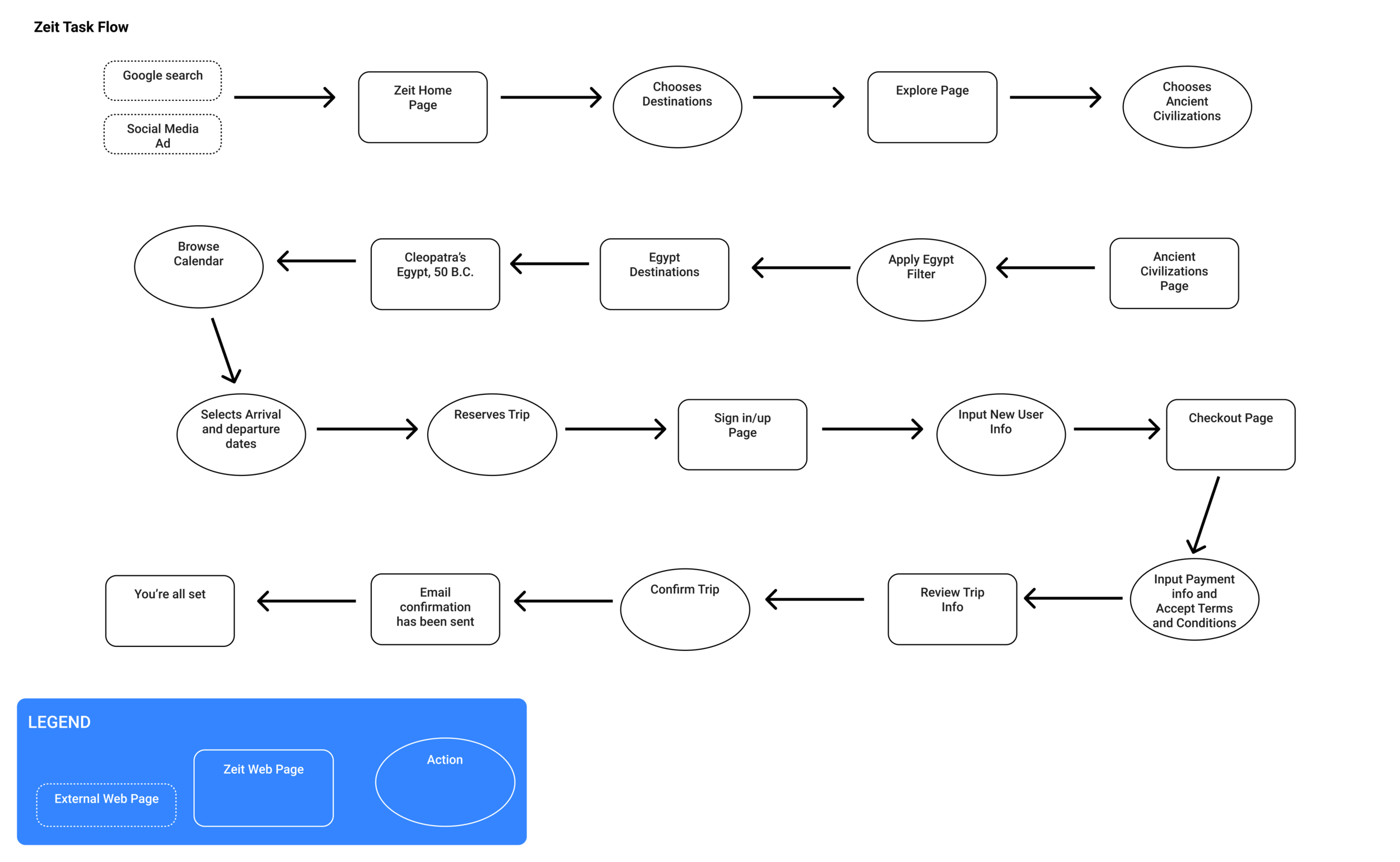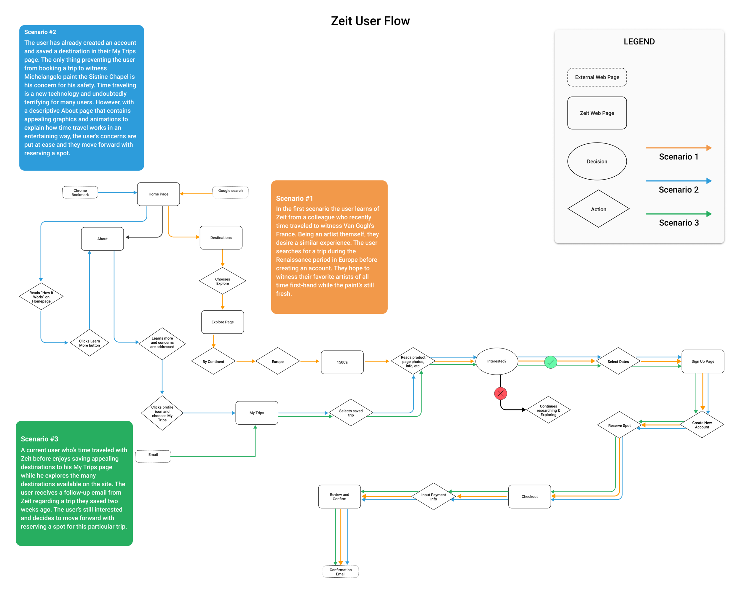 The user flow is based off a persona of the Scholar archetype. The user flow is designed to represent specific scenarios where the user knew what they were looking for, but was open to exploring other destination options. I also made sure to address how users would learn about time travel to ease any concerns they may have.