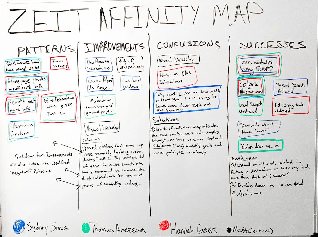 I reviewed my key findings of the usability test and grouped them into four relevant categories; patterns, improvements, confusions, and successes. Then I included additional "solution" sections where I provided potential solutions for the problems identified in each category.