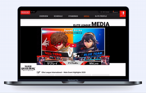 The media page features the most recent Elite League match highlights of each region as well as the latest international match highlights. The featured screen at the top will cycle livestreams of Elite Smash matches 24/7.