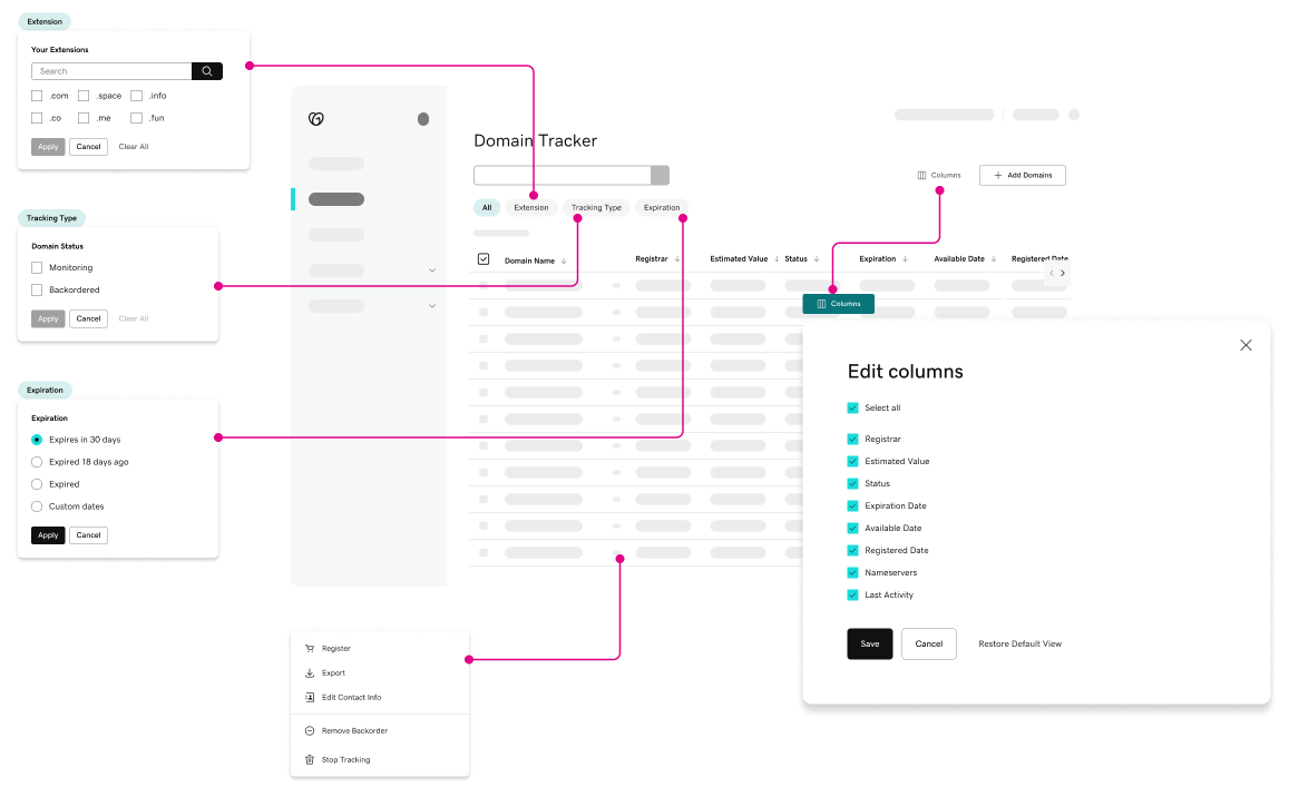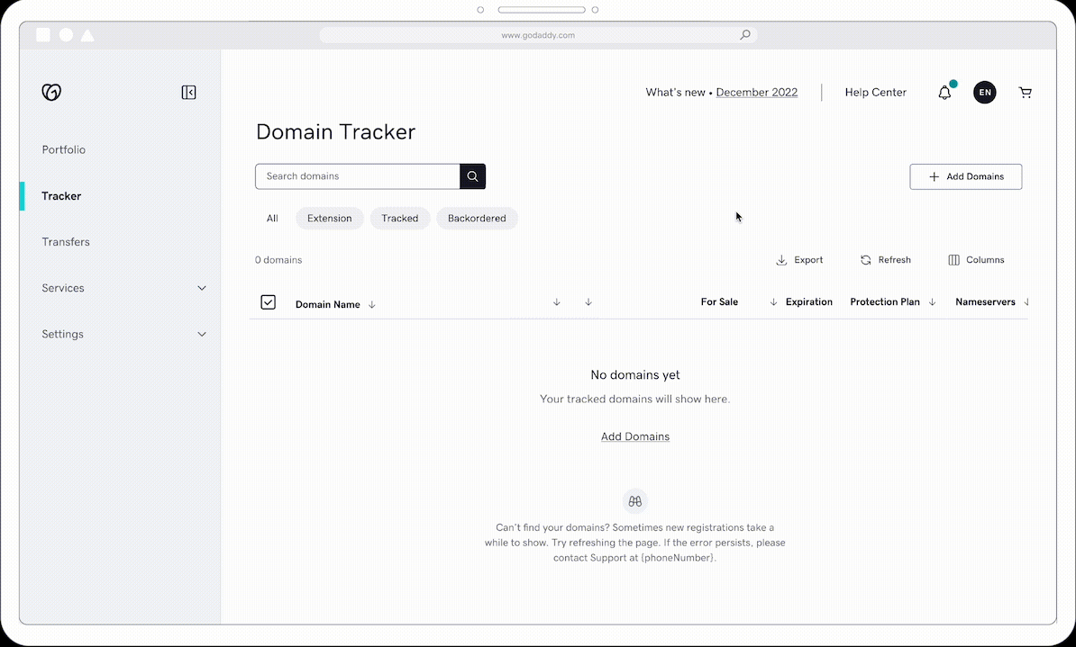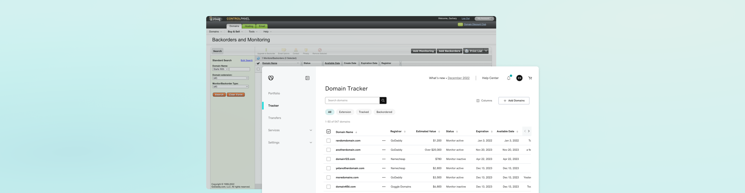 The Domain Tracker was proposed as an evolution of the Backorders and Monitoring experience – giving users a holistic view of their entire domain portfolio regardless of registrar, the power to track any domain’s activity, and backorder desired domains. As powerful as these features are, the Backordering and Monitoring page was nearly indiscoverable and even if users managed to find it, it’s outdated branding and UI appeared more so as a phishing attempt rather than a legitimate GoDaddy product.